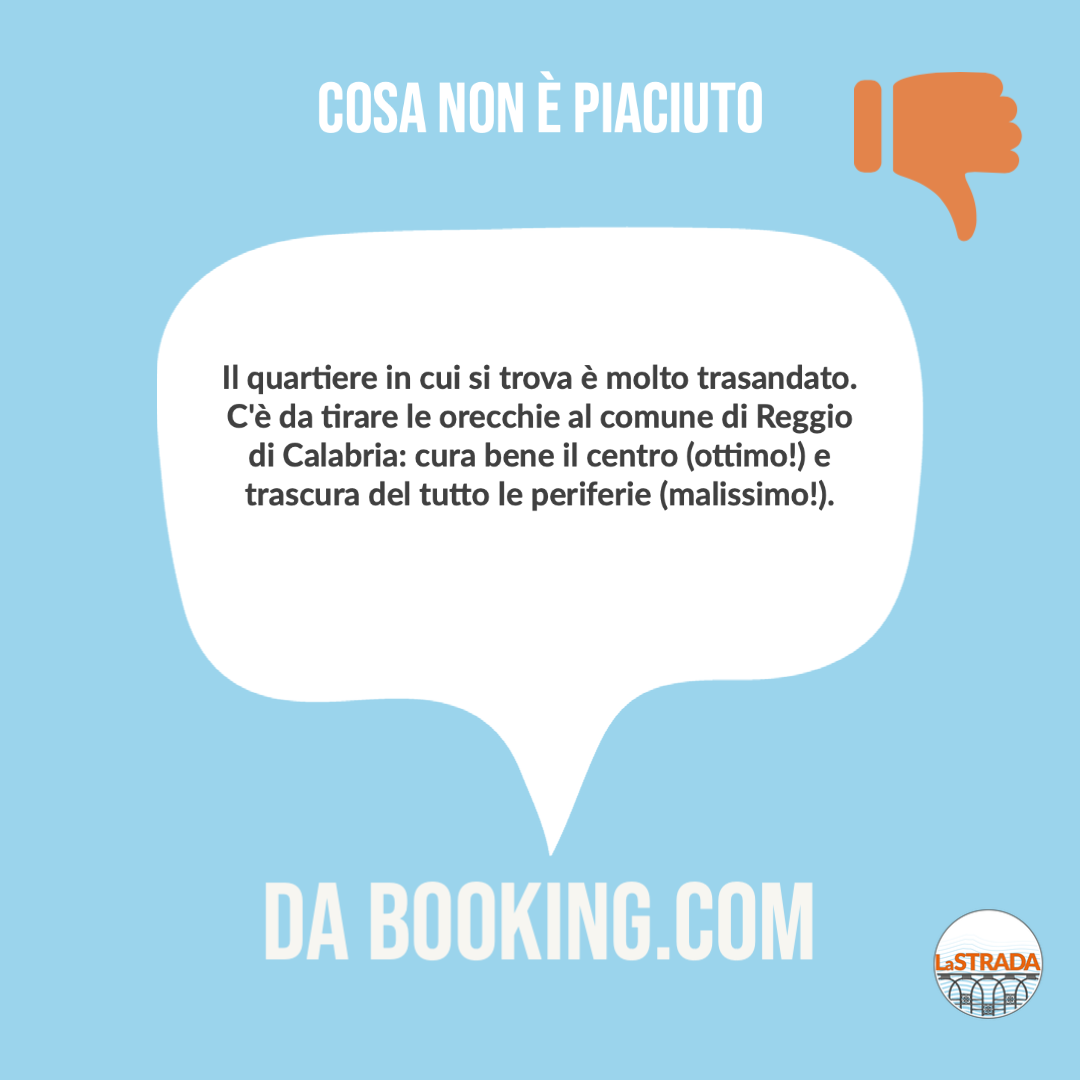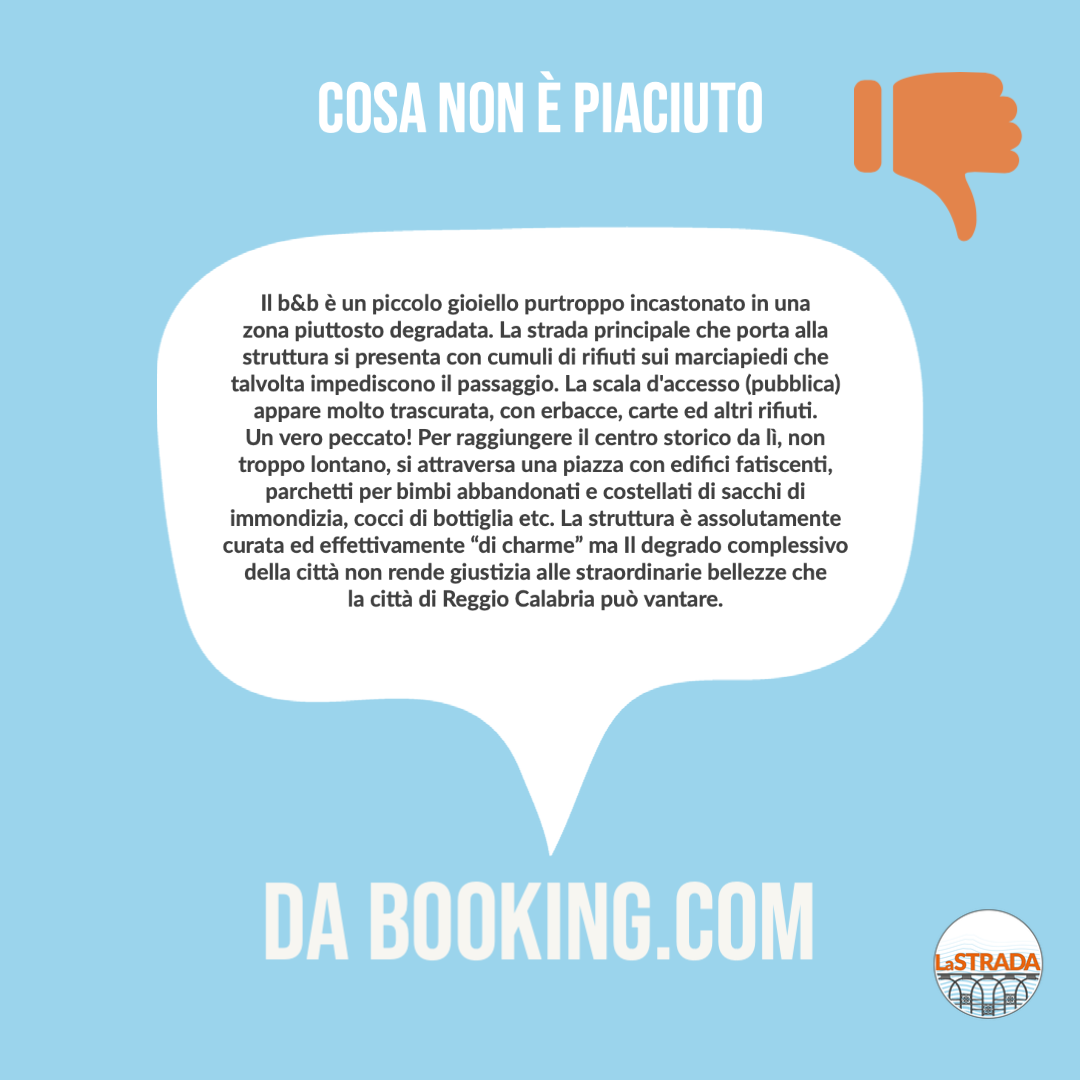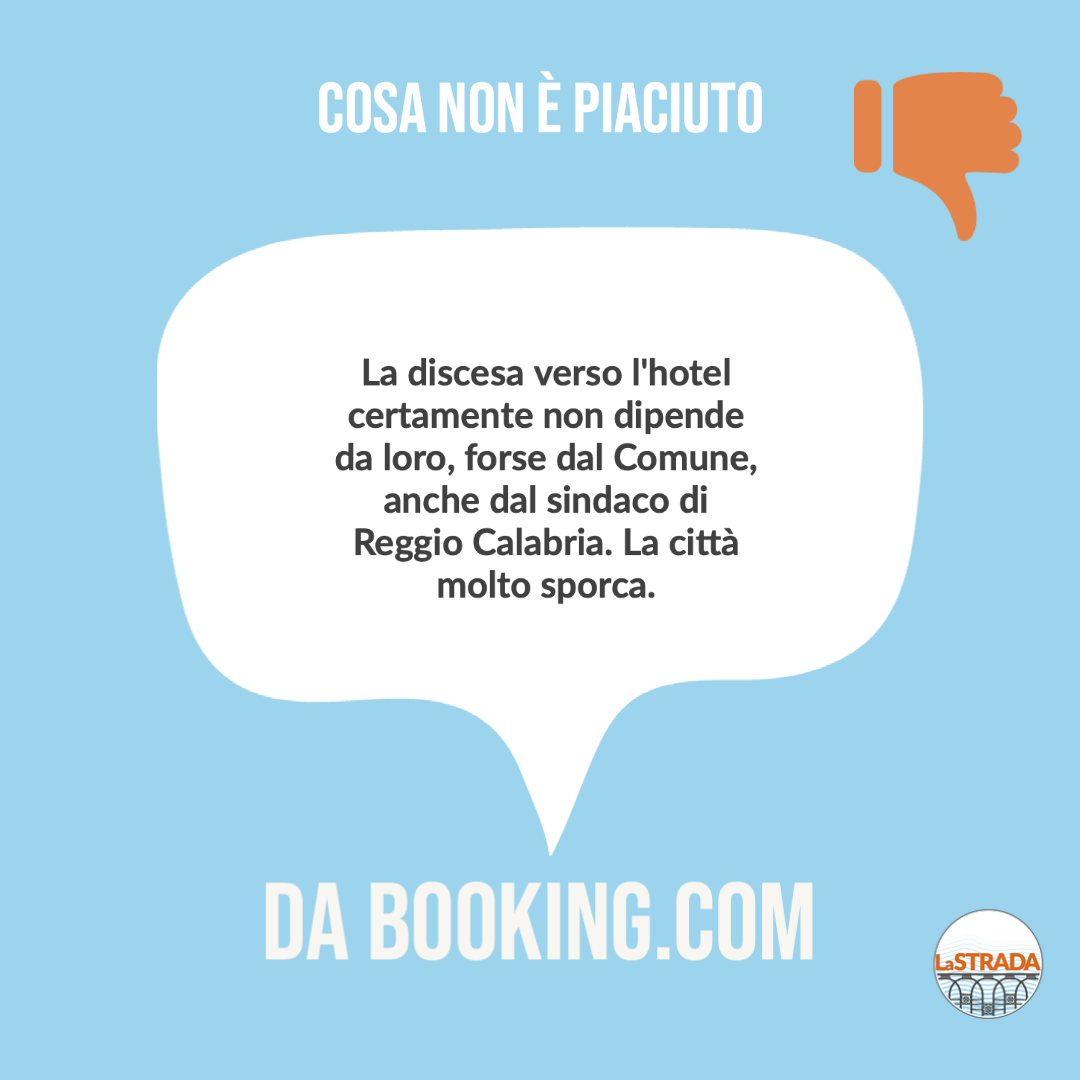 Tra siti archeologici abbandonati da decenni e imprese turistiche virtuose che pagano sulla loro pelle gli effetti di un’amministrazione sciatta – “l’albergo è stupendo, ma la strada per arrivare è buia e piena di buche e spazzatura” –, è evidente che, per poter definire Reggio una città turistica, molto lavoro rimanga ancora da fare. E non si tratta certo di attirare grossi investimenti o realizzare grandi opere: tra tutte le recensioni lette, non ce n’è una che lamenti, per dire, l’assenza del ponte sullo Stretto o la mancanza di grattacieli in riva al mare. Al contrario! Ciò che colpisce in negativo è l’assenza di cura in una città che sì, potrebbe essere bella, ma allo stato attuale è, soprattutto, incapace di volersi bene.
